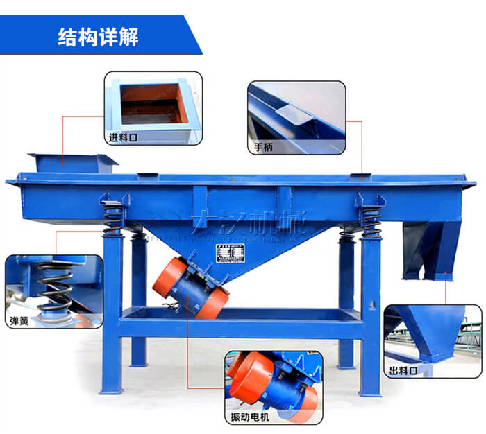 直線振動篩主要由篩箱、篩框、篩網、振動電機、電機臺座、減振彈簧、支架等組成。