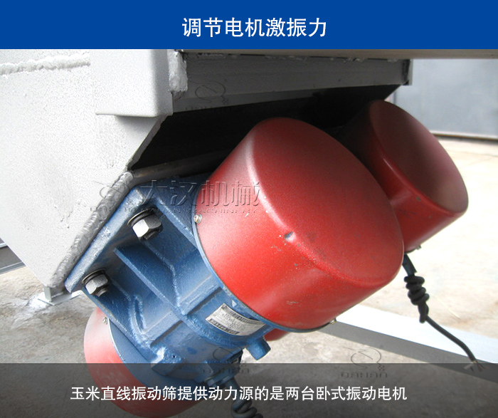 玉米直線振動篩提供動力源的是兩臺臥式振動電機,在設備出廠時電機的激振力是根據用戶提供數據調節好的,在實際使用過程中如出想提高產量也可通過調節兩臺電機偏心重錘的方式增加激振力實現提高產量。這里要注意的時在調節激振力前請先咨詢您的供應商再進行合理調節。