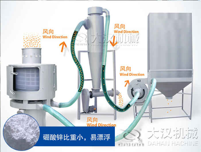 硼酸鋅粒度較小,篩分目數般比較精細,所以使用普通振動篩難以解決物料易漂浮這難題,而氣流篩通過螺旋輸送系統后,和氣流混合、霧化進入網筒內,通過網筒內風輪葉片使物料同時受離心力和旋風推進力,從而近使物料噴射過網,由細料排出口排出,不能過網的物料沿網筒壁從粗料排出口排出,可以解決硼酸鋅易于漂浮這問題。