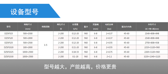 方形振動篩型號有DZSF515、DZSF520、DZSF525、DZSF1020、DZSF1025、DZSF1030,每型號設備的篩網面積、機重、電機功率,產量等均有差異,因此其制造成本也會不樣,那么價格當然也是參差不齊,型號越大,產能越高,價格更貴。