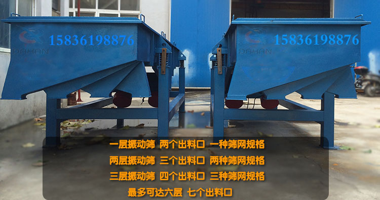 物料從給料機均勻地進入篩分機的進料口,在振動電機的激振下,向出料口方向邊跳動邊篩分,通過多層篩網篩分出數種產品和不合格的篩上、篩下物,分別從各自的出口排出,流入料倉或盛料筒.